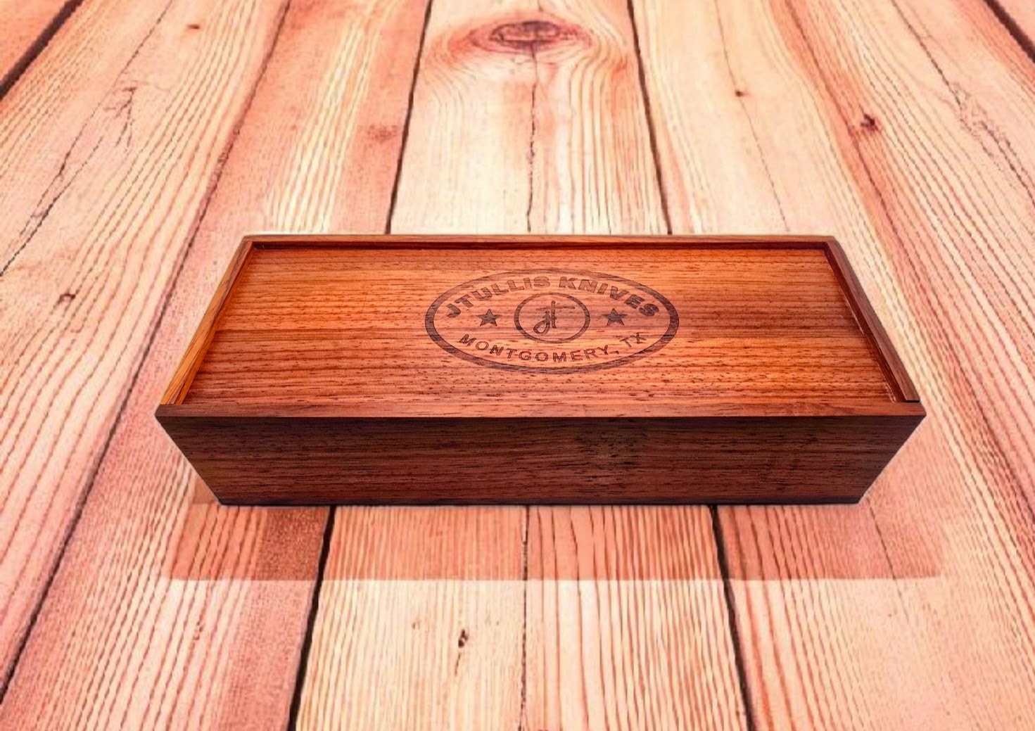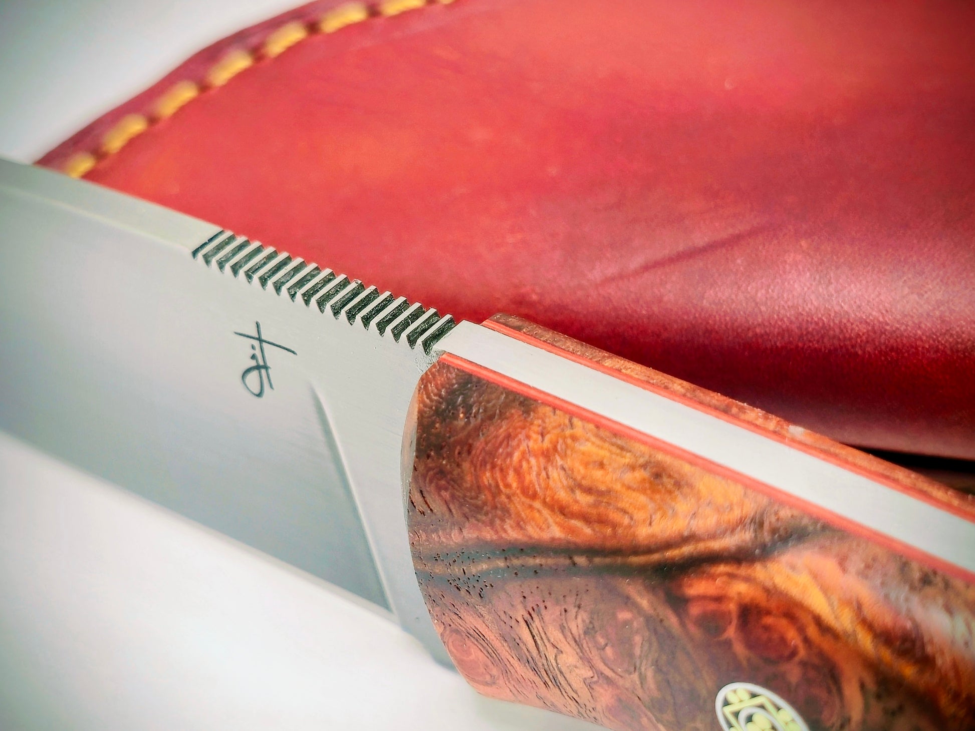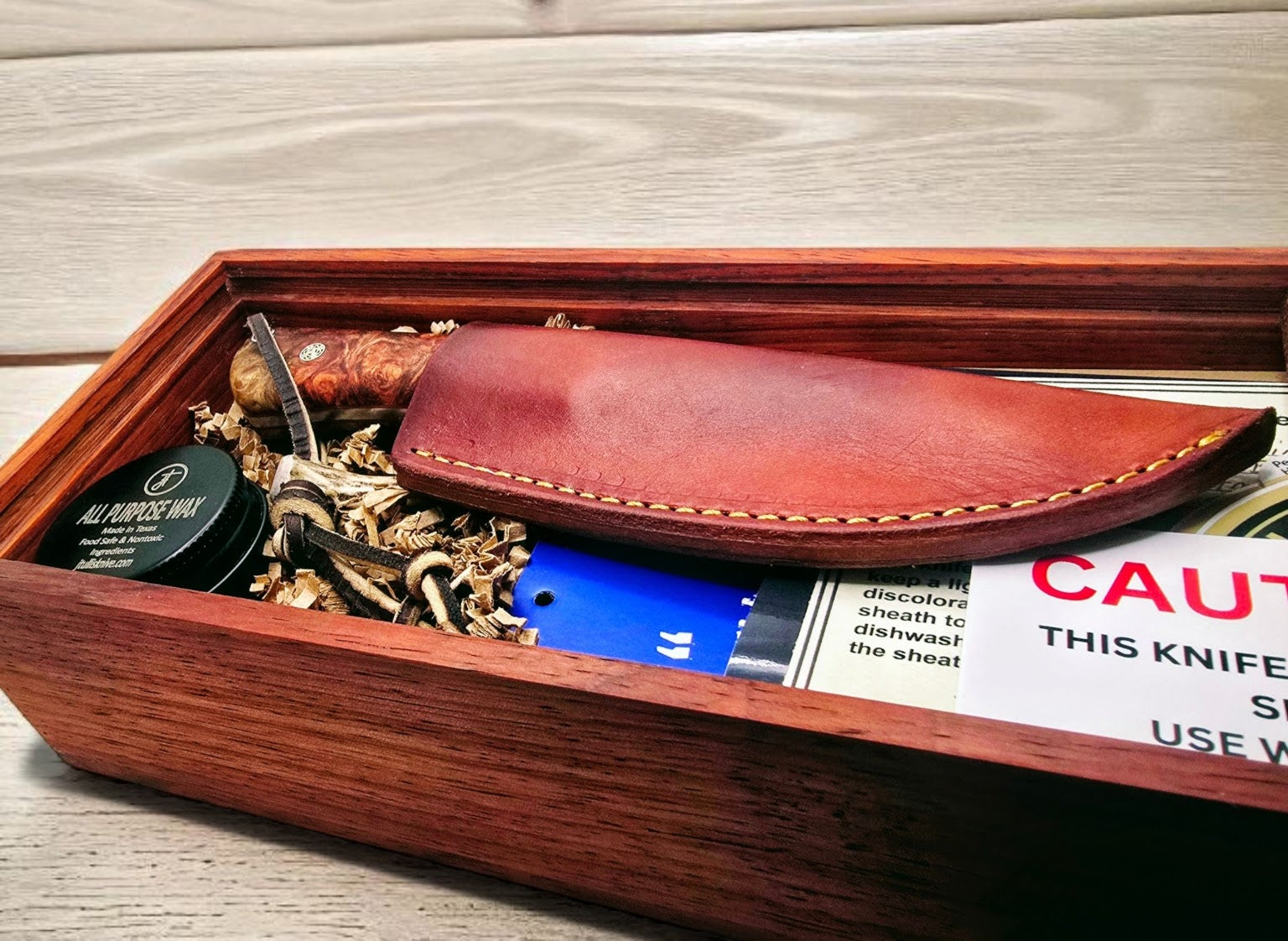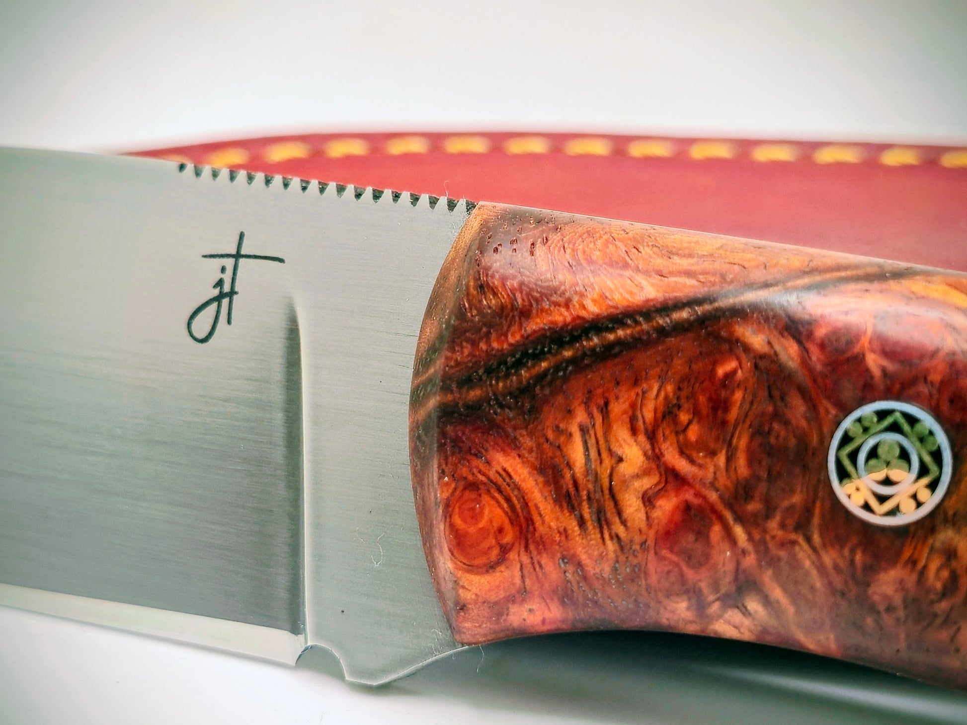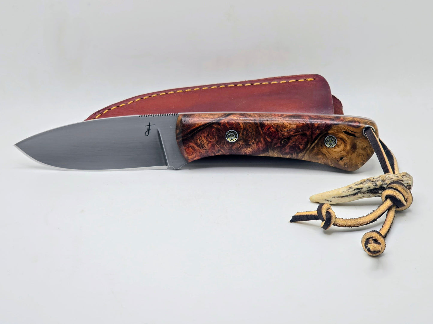 This is my Medina model fixed blade skinner. This knife is perfect for skinning or everyday carry (EDC). The blade is AEB-L stainless steel. AEB-L is a very tough wearing steel with solid edge retention. The handles are gorgeous Amboyna burl with brick-colored liners. The hardware is stainless steel. It comes with a r/h leather sheath and a beautiful Padauk custom presentation box.